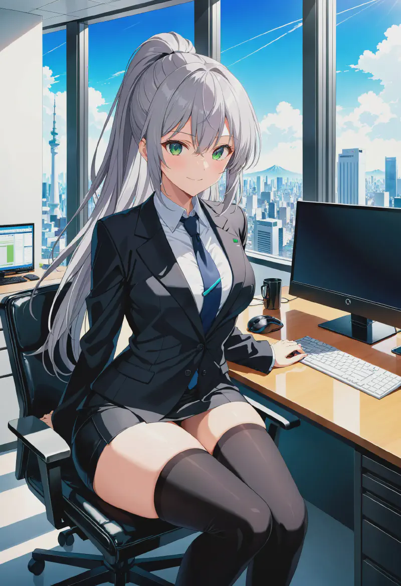 dark blue tie, black pencil skirt, (black thighhighs:1.2),