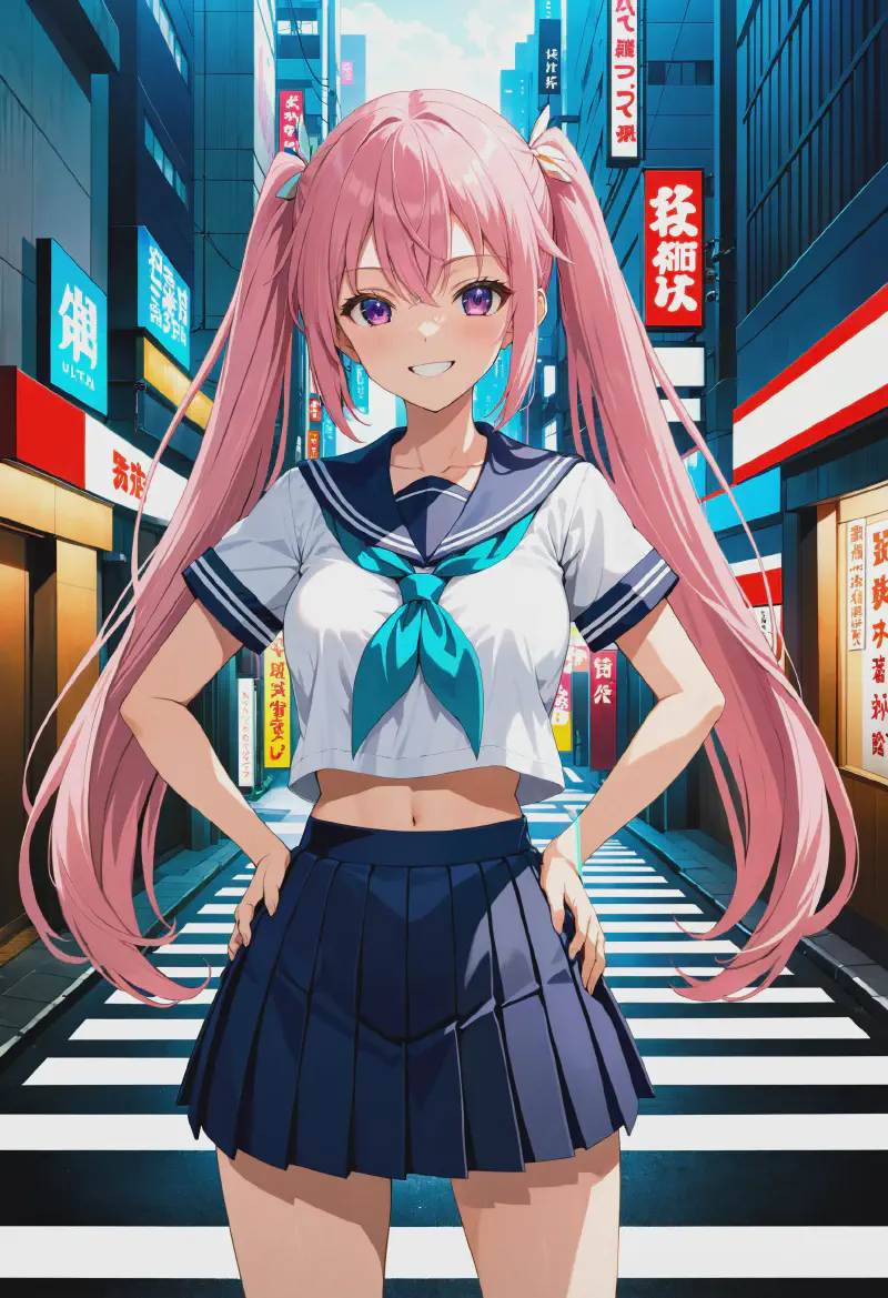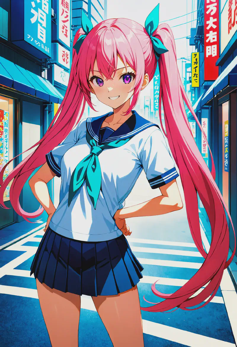最初にいつもテストするのは、もちろんまやちゃんの生成ですね!AnimagineXLのレビューで見てもらった通り、私の最初の典型的なプロンプトは、学校の制服を着たまやちゃんが賑やかな通りで視聴者に手を振るシーンを生成することです。