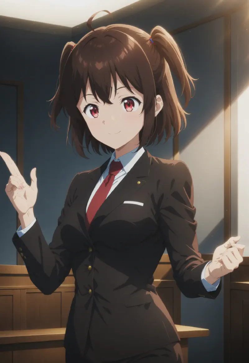intricate dark brown hair, short hair, (two side up), ahoge, red eyes,