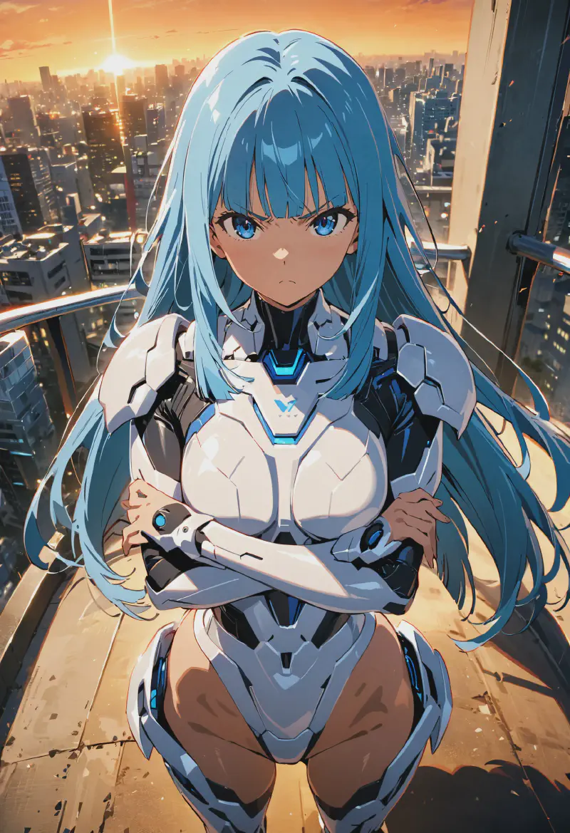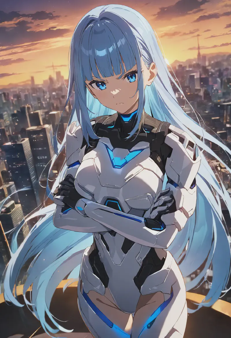 serious, determined, v-shaped eyebrows, (blue:1.2) cyberarmor, breastplate,