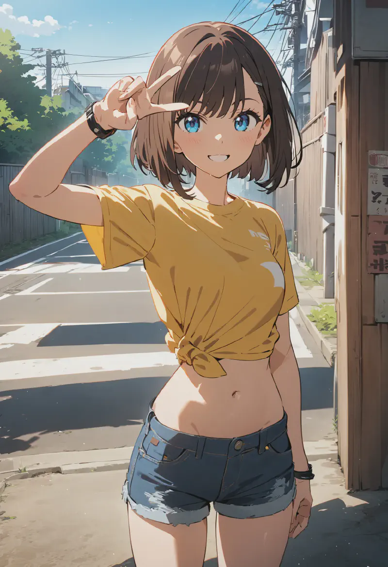 smile, yellow t-shirt, lowleg denim shorts, navel, midriff,