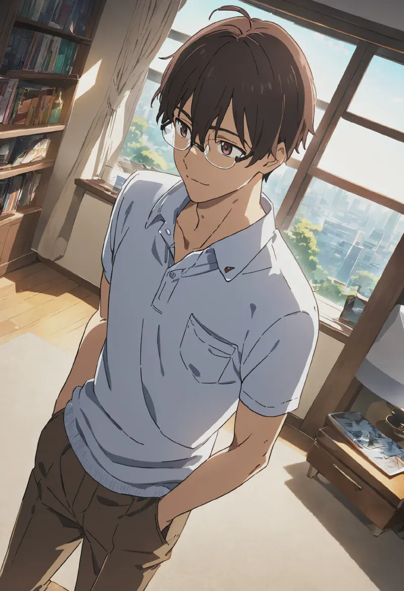 (toned male:0.8), male focus, dark brown hair, dark brown eyes,