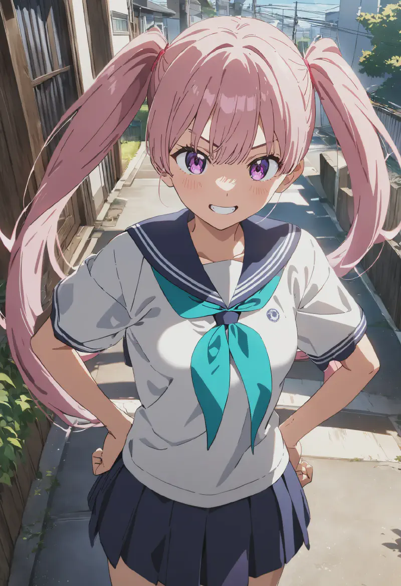 uneven twintails, purple eyes, grin, white sailor shirt,