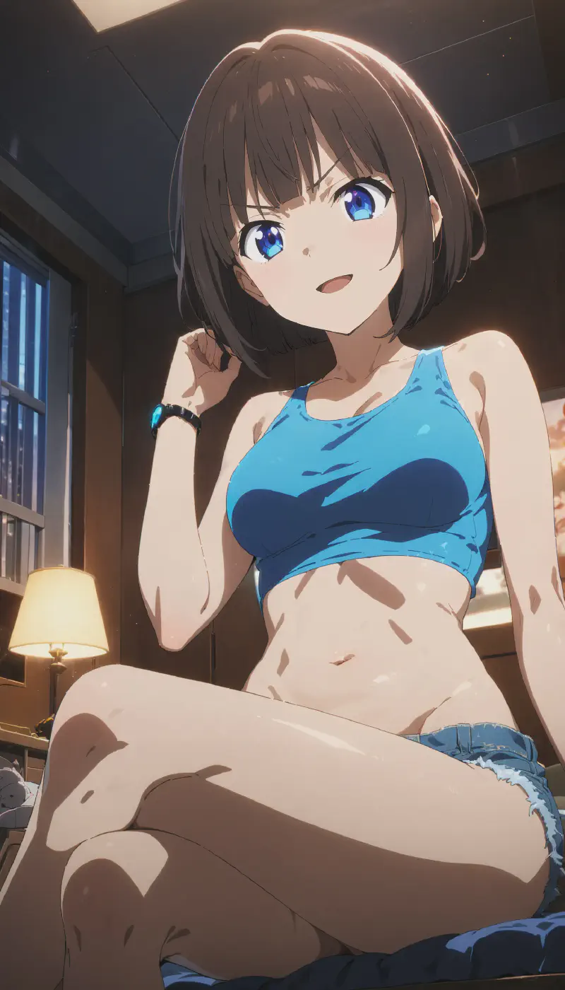confident smile, v-shaped eyebrows, open mouth, blue tank top, cutoffs,