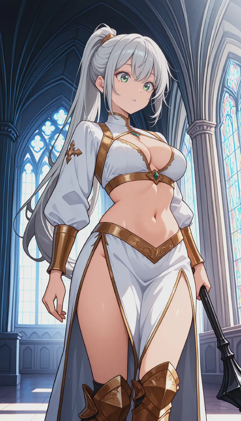 1girl, original, nazonoanya, standing, holding mace, mace, holding weapon, athletic, medium breasts, very long hair, grey hair, green eyes, smile, ponytail, hair ornament, white robe, gold trim, embroidered dress, cleavage, skirt, side slit, midriff, navel, groin, gold cuffs, kneehighs, greaves, church, pillar, stained glass, cathedral, indoors, day, fantasy, medieval, <lora:Anya:0.9>