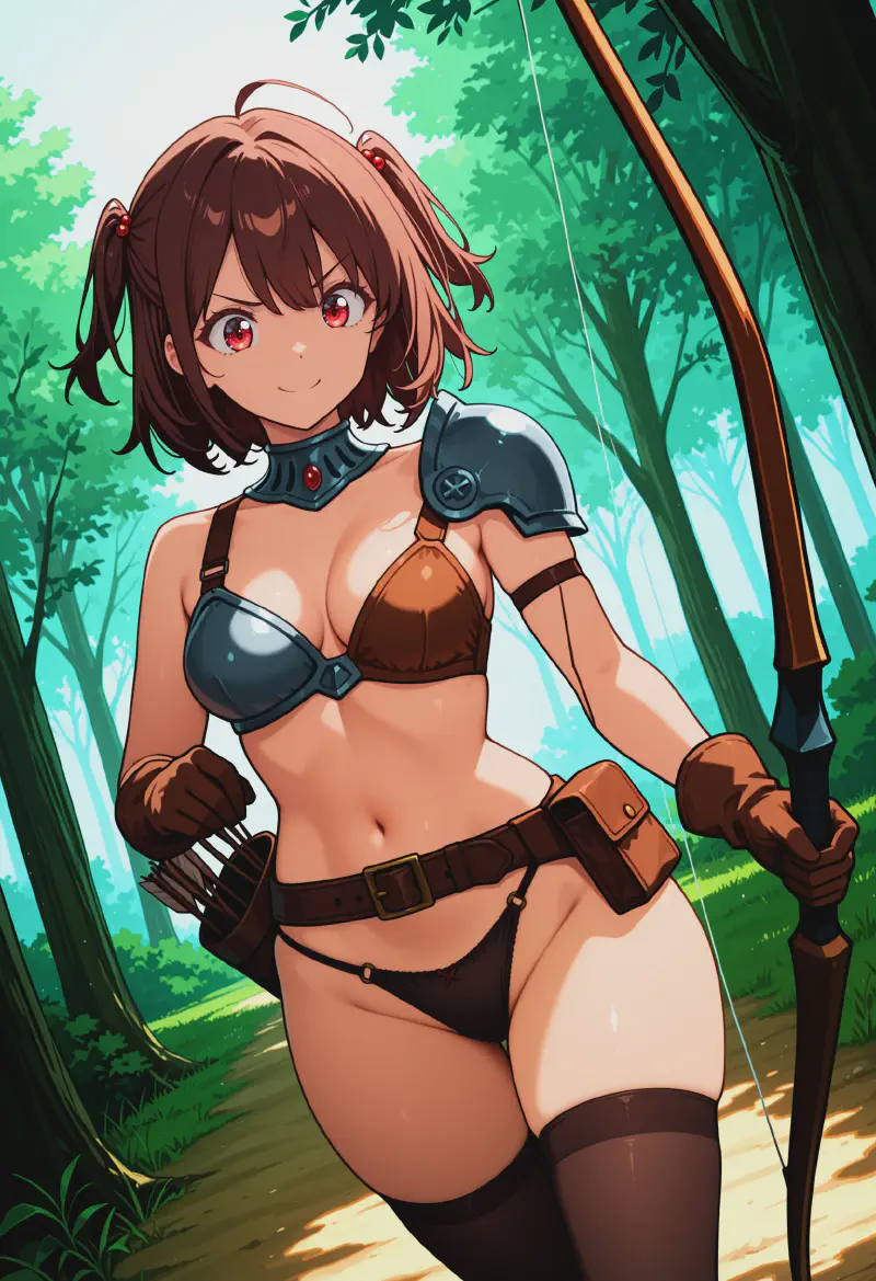 1girl, original, aramakieiko, standing, archery, holding bow \(weapon\), holding arrow, bow \(weapon\), arrow \(projectile\), athletic, medium breasts, brown hair, two side up, red eyes, smile, v-shaped eyebrows, bikini armor, black panties, brown bra, belt, belt buckle, belt pouch, dagger, thighhighs, compound bow, collarbone, cleavage, gorget, gloves, hair ornament, navel, groin, linea alba, mismatched gloves, (muneate:1.05), armor, quiver, revealing clothes, brown gloves, shoulder armor, single shoulder pad, forest, tree, grass, path, dappled sunlight, day, outdoors, chiaroscuro, fantasy, medieval <lora:Eiko_Aramaki:0.9>