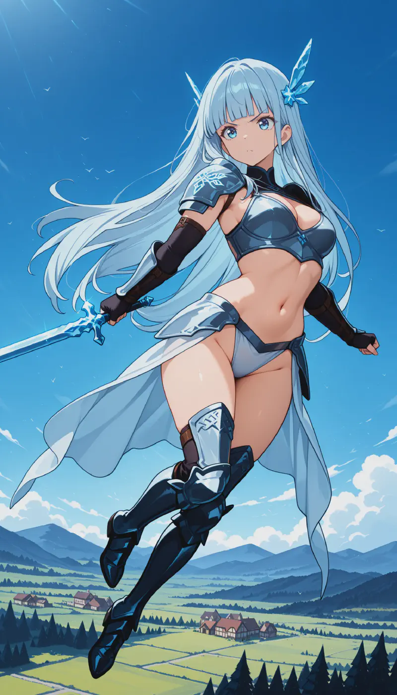 1girl, original, mayaalt, flying, midair, full body, holding weapon, short sword, holding sword, shining sword, metal buckler, athletic, medium breasts, very long hair, light blue hair, blunt bangs, blue eyes, serious, determined, v-shaped eyebrows, valkyrie, bodycon, breastplate, silver breastplate, shoulder guard, armored skirt, armored leggings, faulds, tassets, navel, groin, thighs, fingerless gloves, gauntlets, waist cape, winged boots, sigil, glowing sigil, fantasy, medieval, plain, cloud, sky, blue sky, village view, village, day, sunlight, cinematic angle, cinematic lighting, dot nose, anime coloring, newest, year 2024, masterpiece, best quality, amazing quality, absurdres, very aesthetic <lora:Maya_Hirukawa_transformed:0.9>