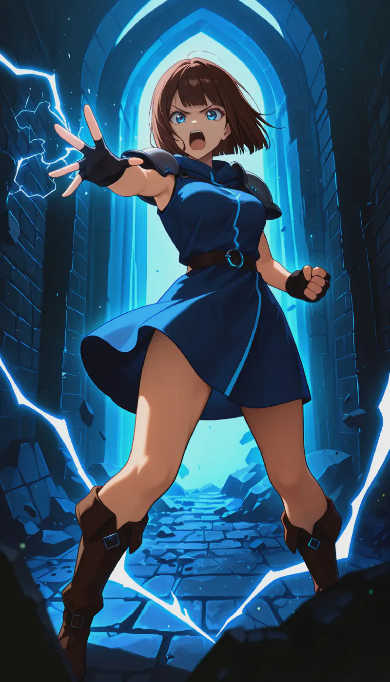 1girl, original, hirukawamaya, running, full body, growling, aggressive, incoming attack, clawing, looking at viewer, angel wings, (electricity:1.2), athletic, medium breasts, brown hair, bob cut, blue eyes, serious, determined, clenched teeth, fangs, brown robe, (torn clothes:1.2), (torn dress:1.3), (exploding clothes:1.4), wind, cloth pieces, glowing emblem on neck and glowing runes on thighs. bare shoulders, navel, groin, medieval, village, alley, surrounded, surrounded by menacing human soldiers wearing heavy armor. henshin, (chiaroscuro), outdoors <lora:Maya-Hirukawa:0.9>