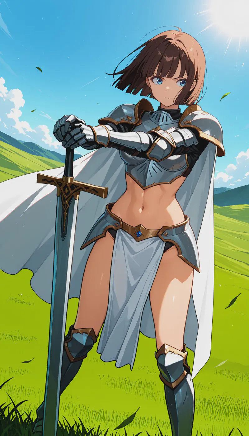 1girl, original, hirukawamaya, holding sword, planted sword, two-handed, full body, long sword, knight, paladin, athletic, medium breasts, brown hair, blue eyes, serious, determined, v-shaped eyebrows, royal, paladin, bikini armor, plate armor, breastplate, tassets, pelvic curtain, navel, groin, linea alba, cape, pauldrons, hill, grass, wind, leaves, outdoors, day, sun, blue sky, cloud, summer, day, <lora:Maya-Hirukawa:0.9>