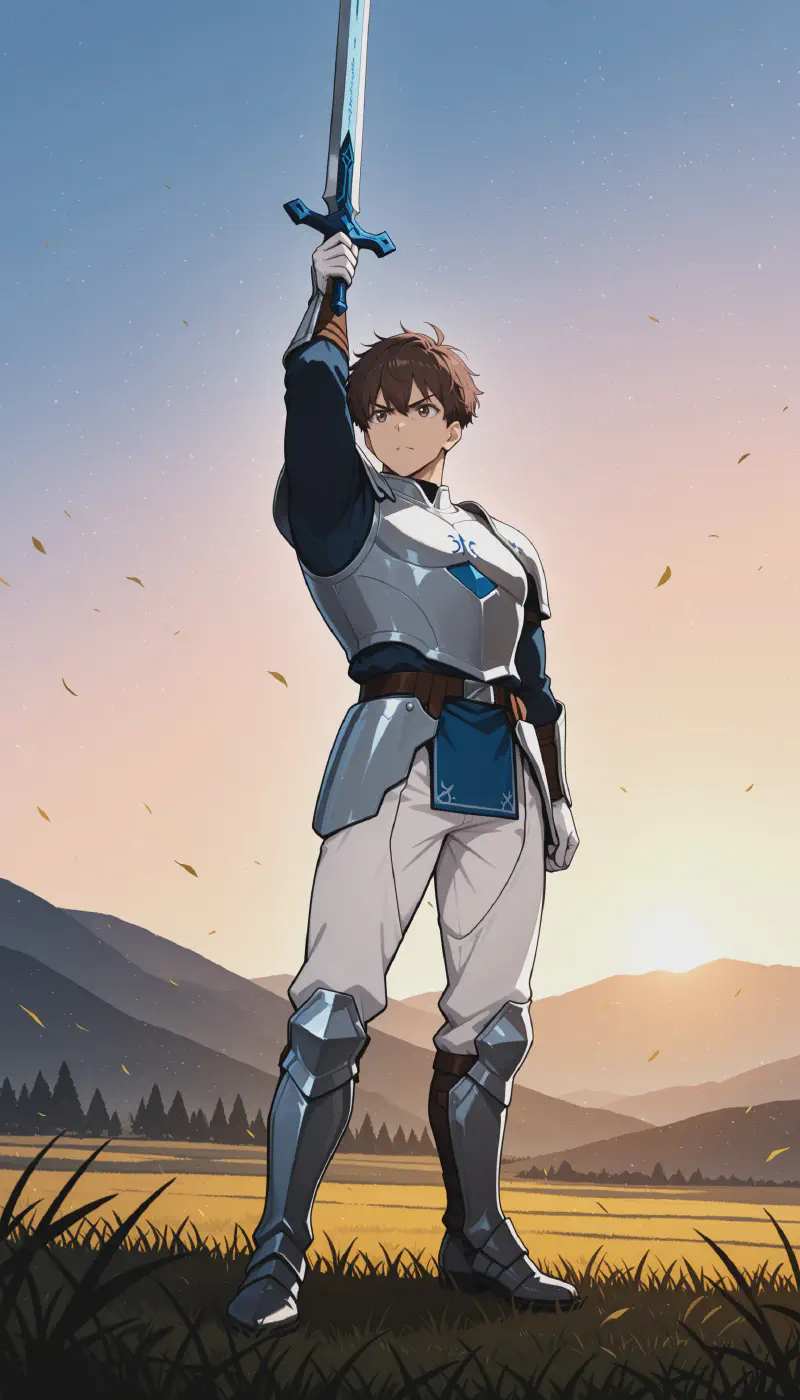 1boy, original, yamasetakeshi, arm up, full body, holding weapon, holding sword, long sword, shining sword, male focus, mature male, brown hair, brown eyes, short hair, (ahoge:0.9), serious, determined, v-shaped eyebrows, armor, white gauntlets, white cuisses, white leggings, embroidered armor, faulds, paladin, hill, wind, leaves, gradient sky, sunrise, dawn, fantasy, medieval <lora:Takeshi_Yamase:0.9>