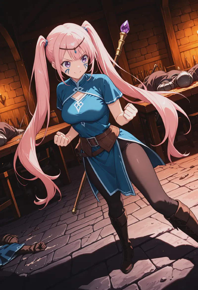 1girl, original, inoyuka, fighting stance, standing, clenched hands, (weapon on back), wooden staff, mage staff, battle, brawl, athletic, medium breasts, pink hair, twintails, very long hair, purple eyes, smile, v-shaped eyebrows, face paint, blue tunic, tight clothes, loincloth, circlet, leggings, knee boots, leather boots, tavern, surrounded, surrounded by brigands, unconscious brigand lying on the floor, turned over table, spill, messy room, indoors, stone floor, fantasy, medieval, <lora:Yuka_Ino:0.9>
