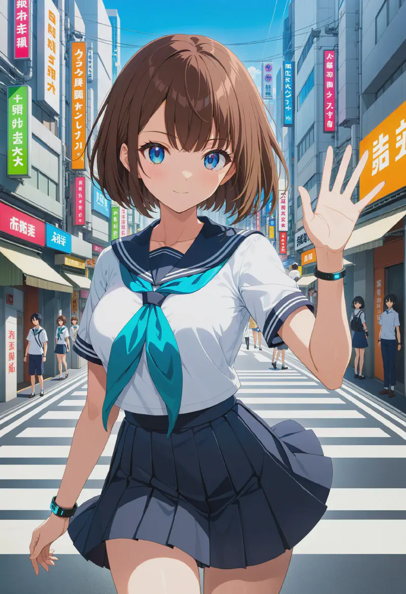 最初にいつもテストするのは、もちろんまやちゃんの生成ですね!AnimagineXLのレビューで見てもらった通り、私の最初の典型的なプロンプトは、学校の制服を着たまやちゃんが賑やかな通りで視聴者に手を振るシーンを生成することです。