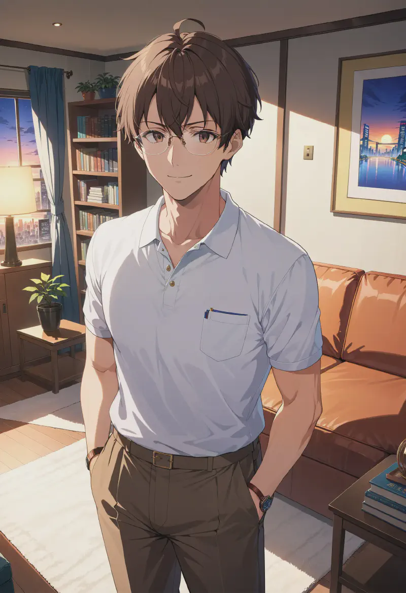 frameless glasses, hands in pockets, white polo shirt, breast pocket,