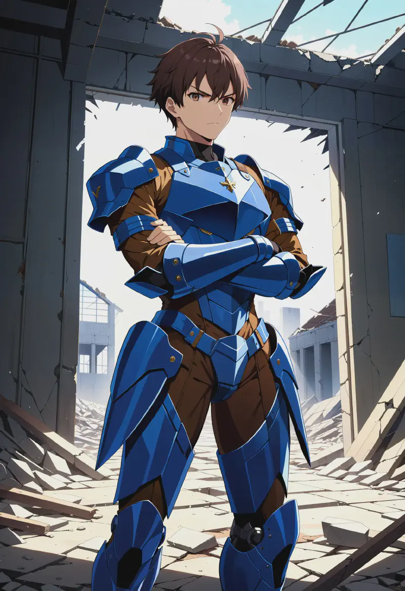 serious, determined, v-shaped eyebrows, blue cyberarmor, breastplate,