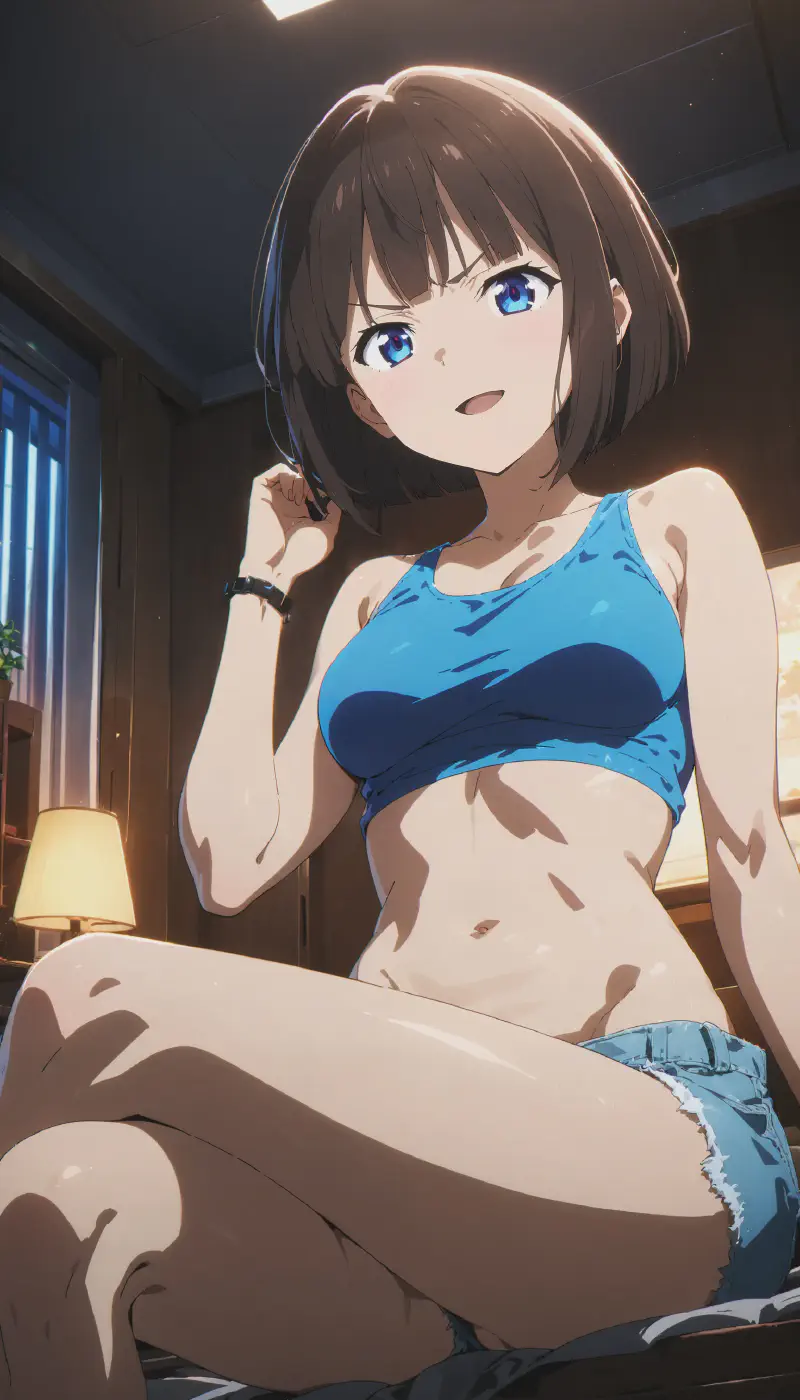 confident smile, v-shaped eyebrows, open mouth, blue tank top, cutoffs,